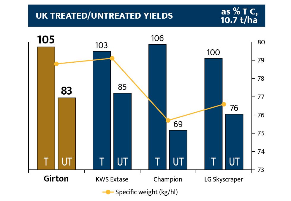Suitable for drilling from 1st September onwards – and as a secondor more cereal, Girton offers growers the reliability they have come to know and depend on from Graham. Bold grain and high specific weight adds to the appeal as a hard feed type. Early maturing so easy to sequence in partnership with other hard feed types, with the flexibility of incredibly stiff straw that allows the agronomist to be more flexible in their approach.