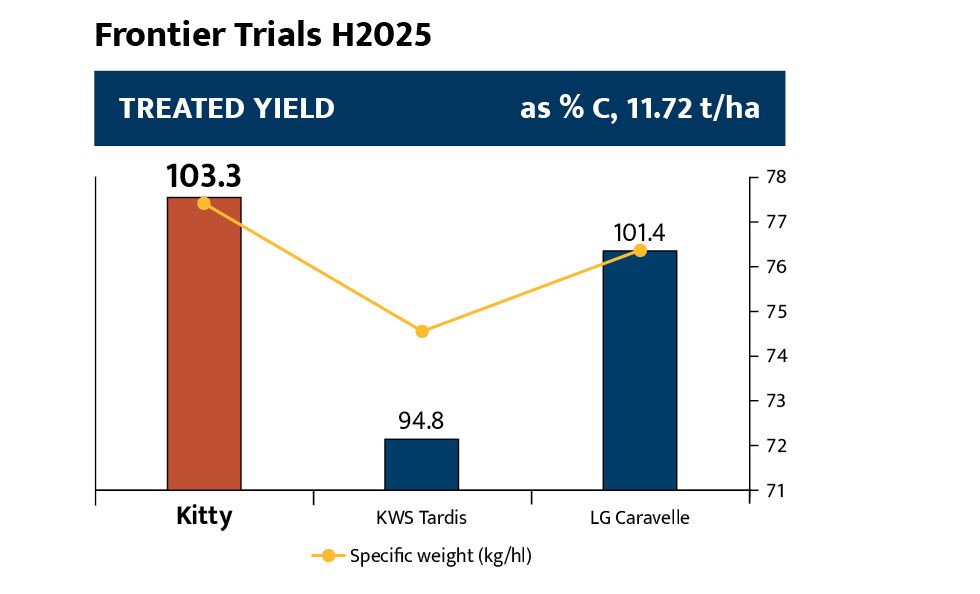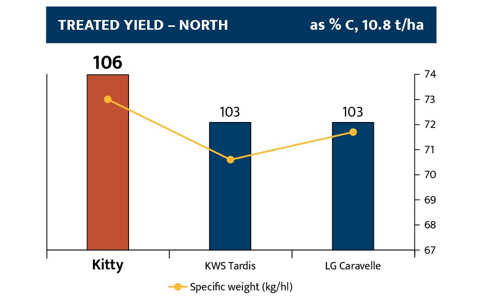 Kitty has exceptional grain quality with a specific weight of 73.0 kg/hl, compared to KWS Tardis at 70.6. Kitty also has very low screening losses.